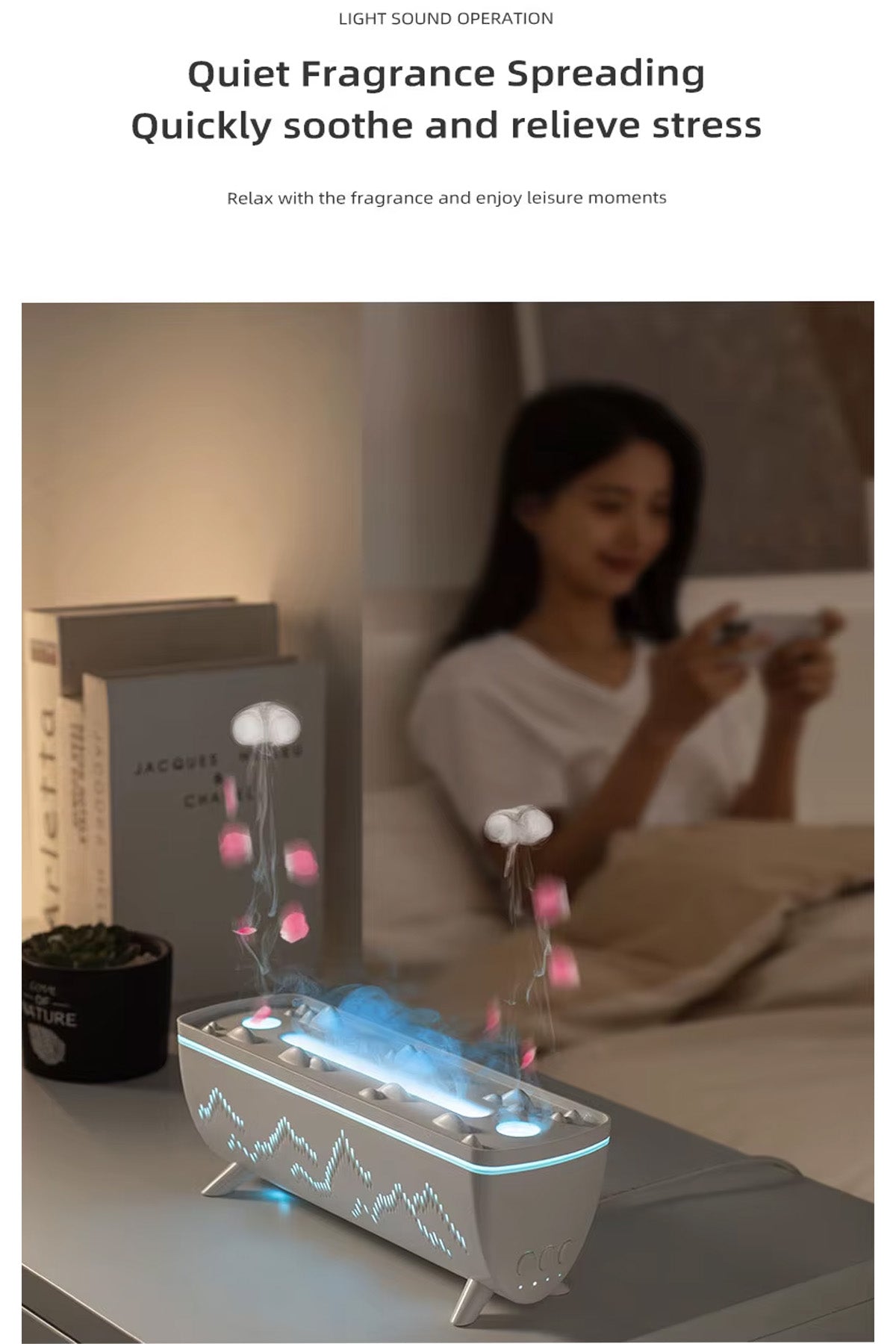 - Dekompresyon yağmur damlalarıyla sessiz nemlendirme, geceleri iyi uyumaya ve stresi azaltmaya yardımcı olur.